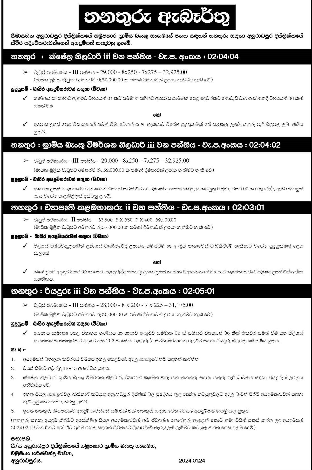 Field Officer, Investigation Assistant, Project Manager, Driver - Anuradhapura District Co-operative Rural Bank union Ltd
