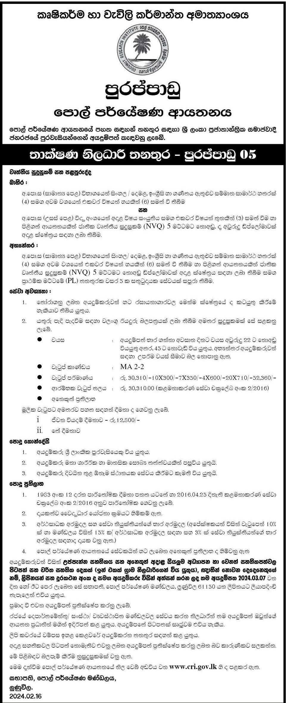 Technical Officer - Coconut Research Institute