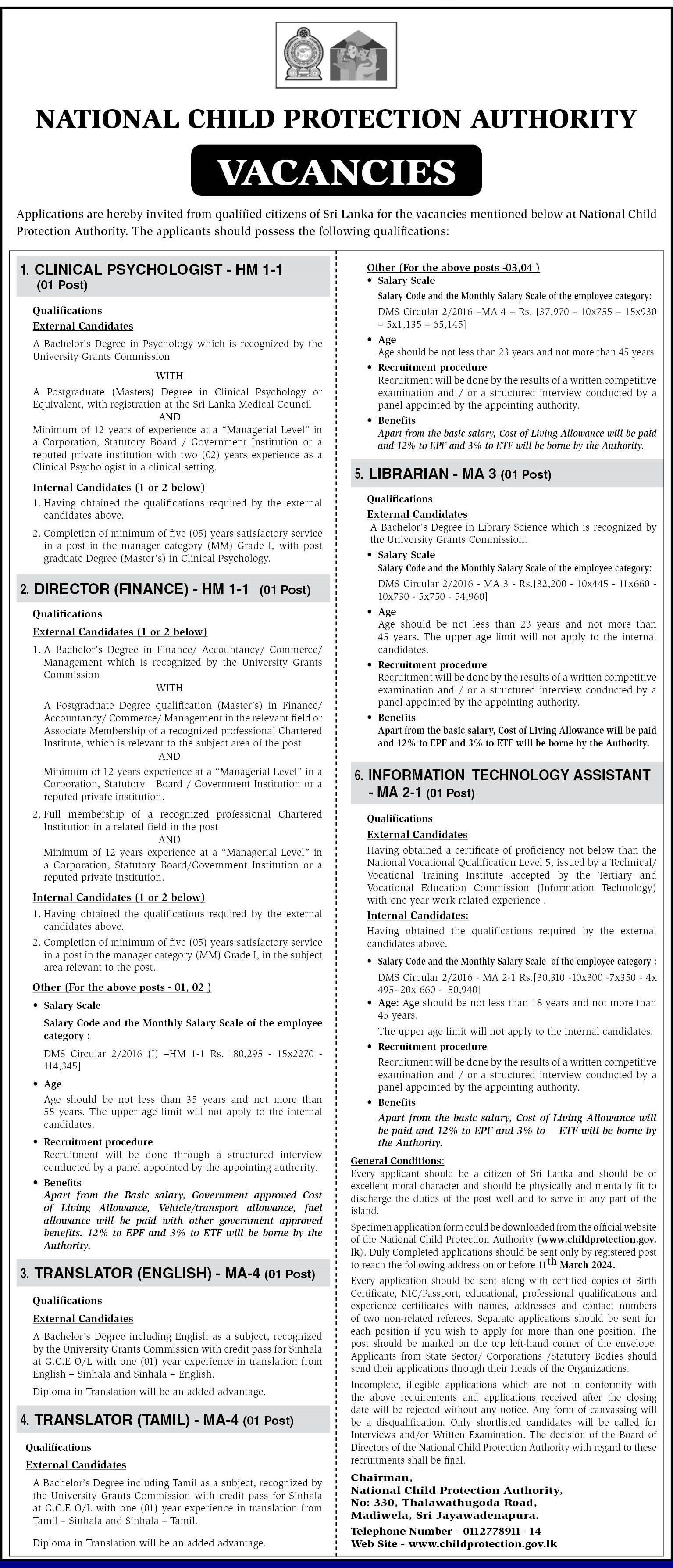 Clinical Psychology, Director, Translator - National Child Protection Authority