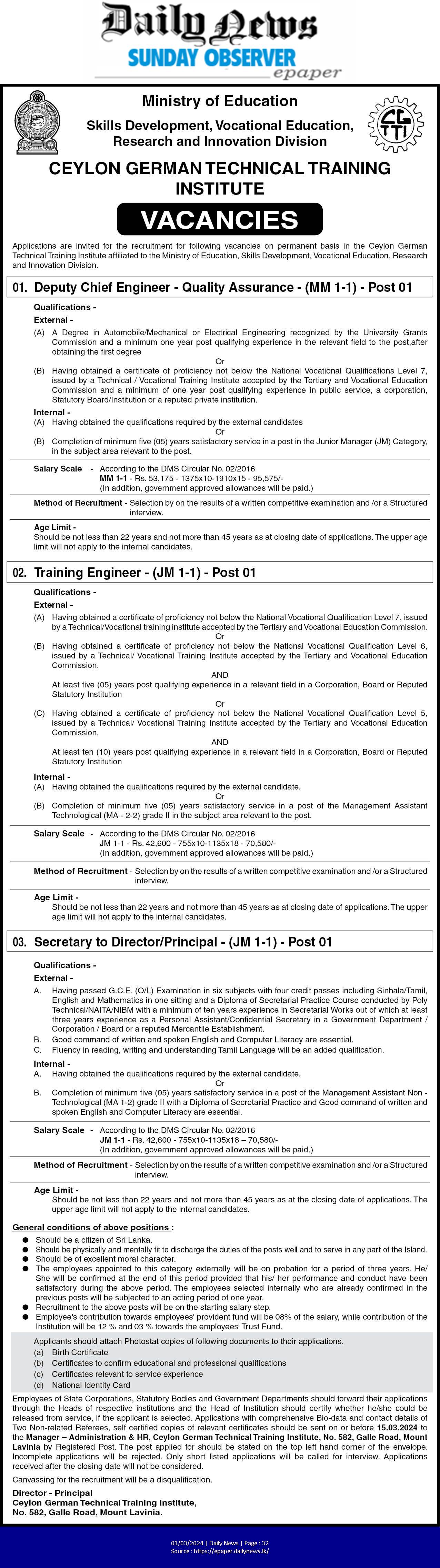 Deputy Chief Engineer, Engineer - Ceylon German Technical Training Institute
