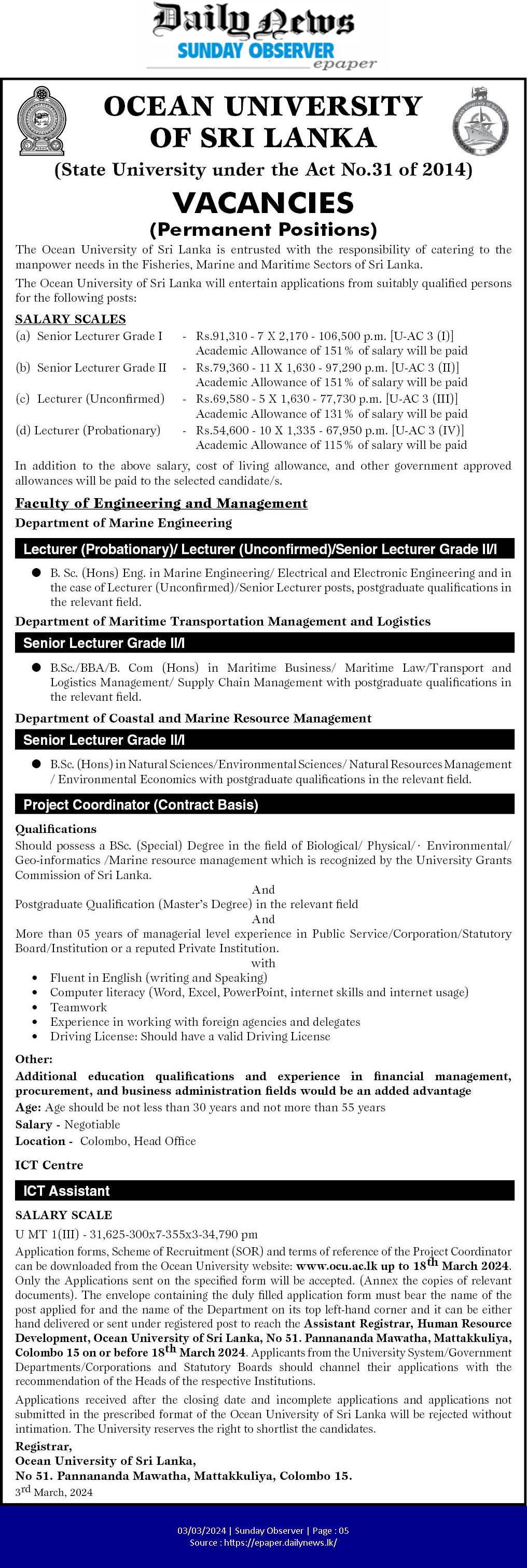 Senior Lecturer, Lecturer - Ocean University of Sri Lanka