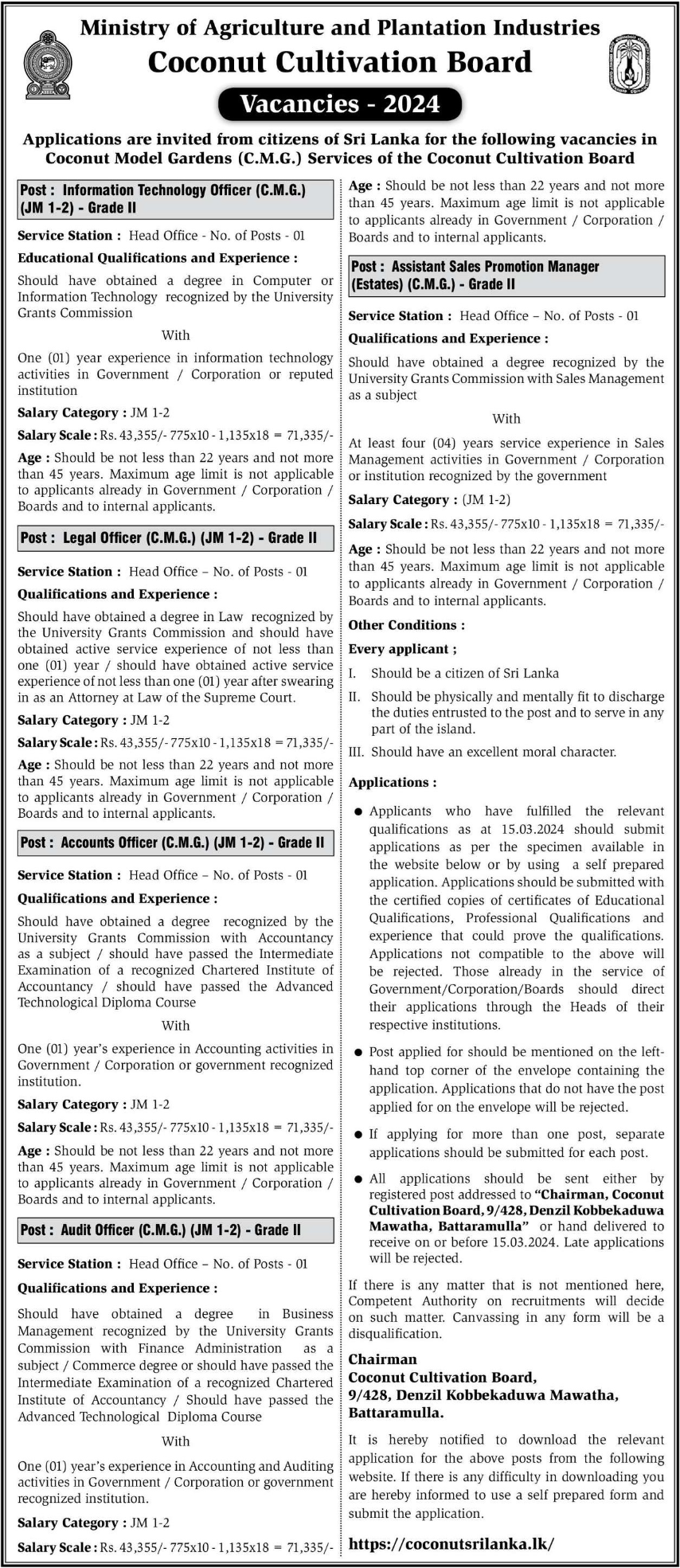 IT Officer, Legal Officer, Accounts Officer - Coconut Cultivation Board