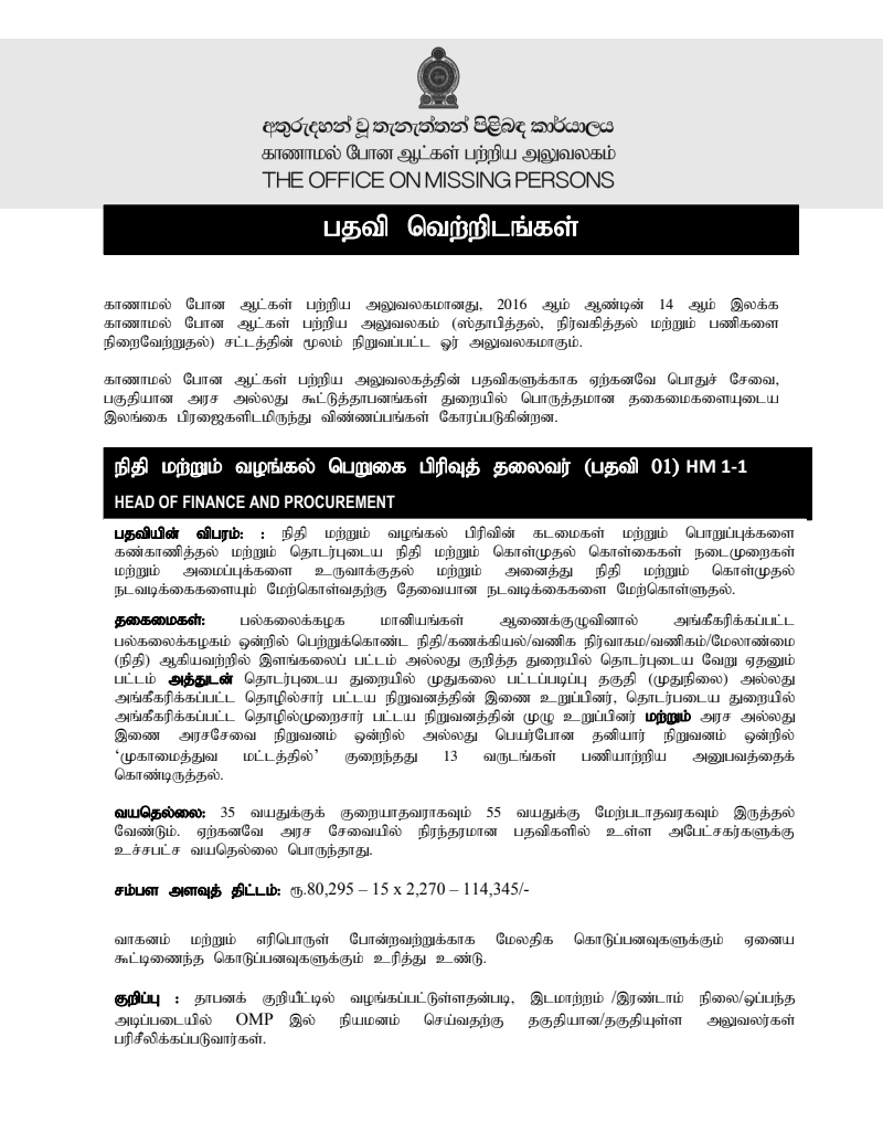 Head of Finance & Procurement, Management Assistant - The Office On Missing Persons