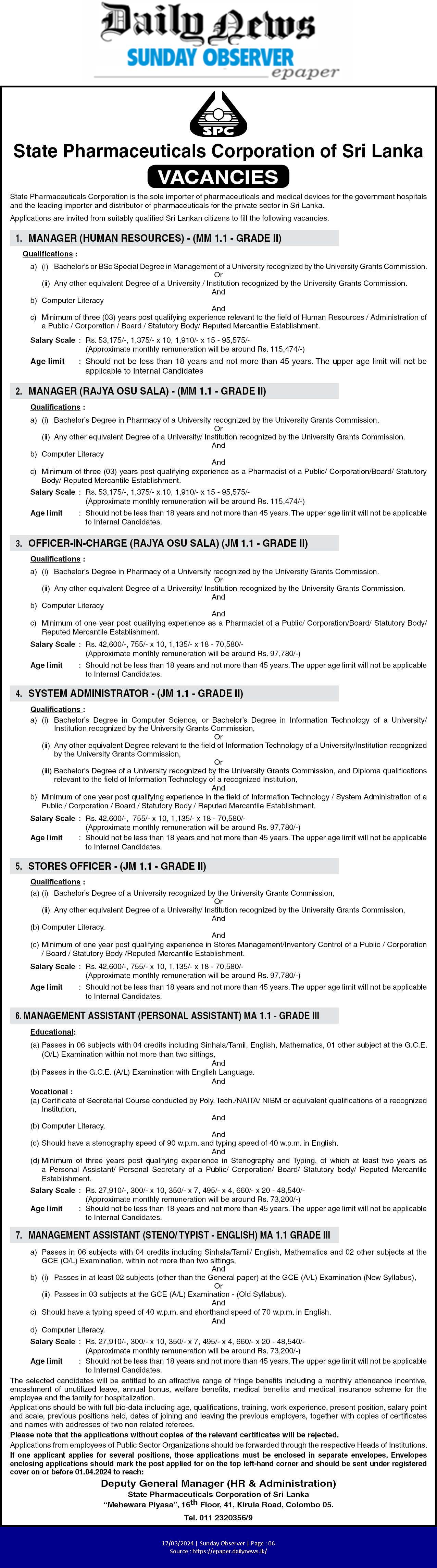 Manager, Officer In Charge,System Administrator - State Pharmaceuticals Corporation of Sri Lanka