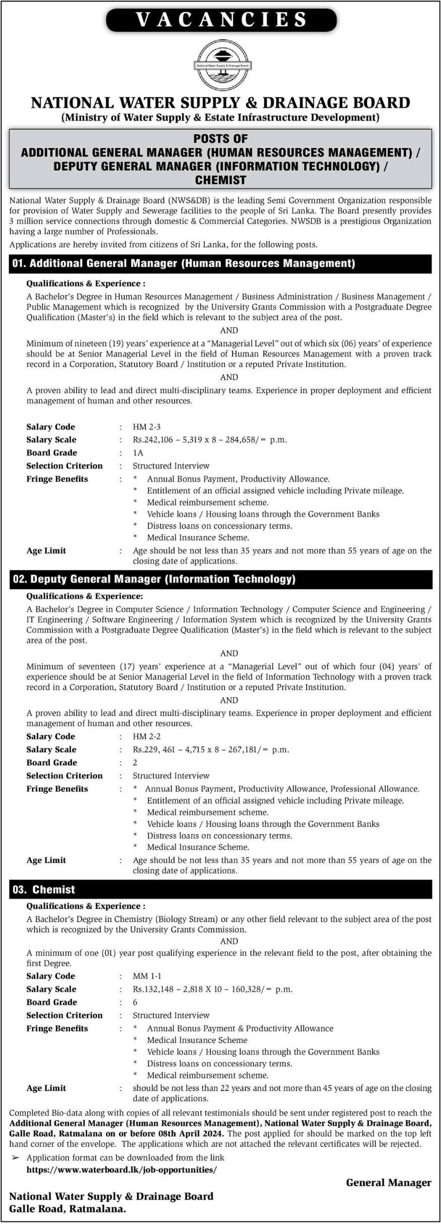 Additional General Manager, Deputy General Manager, Chemist - National Water Supply and Drainage Board