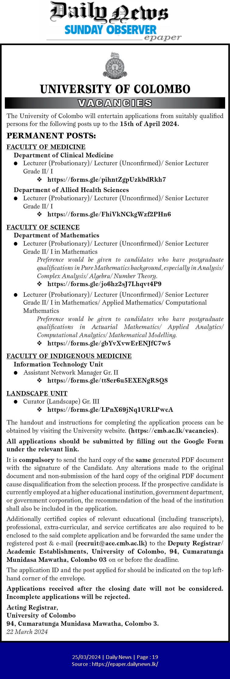 Lecturer, Senior Lecturer, Assistant Network Manager, Curator - University of Colombo