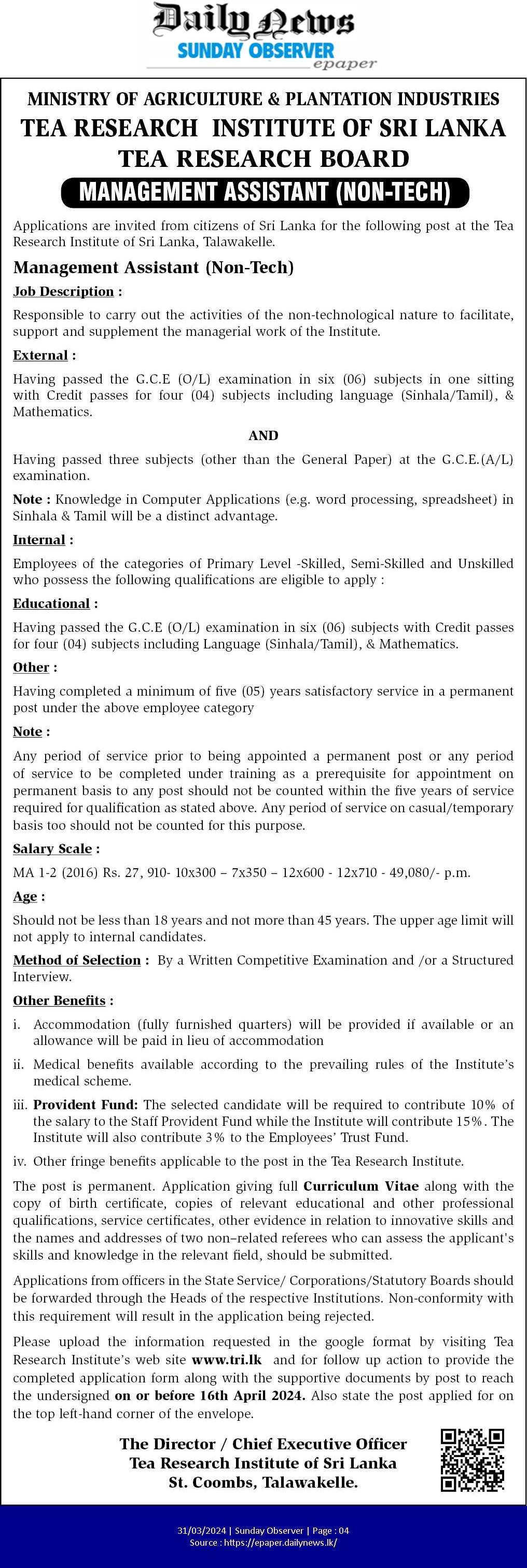 Management Assistant - Sri Lanka Tea Research Board