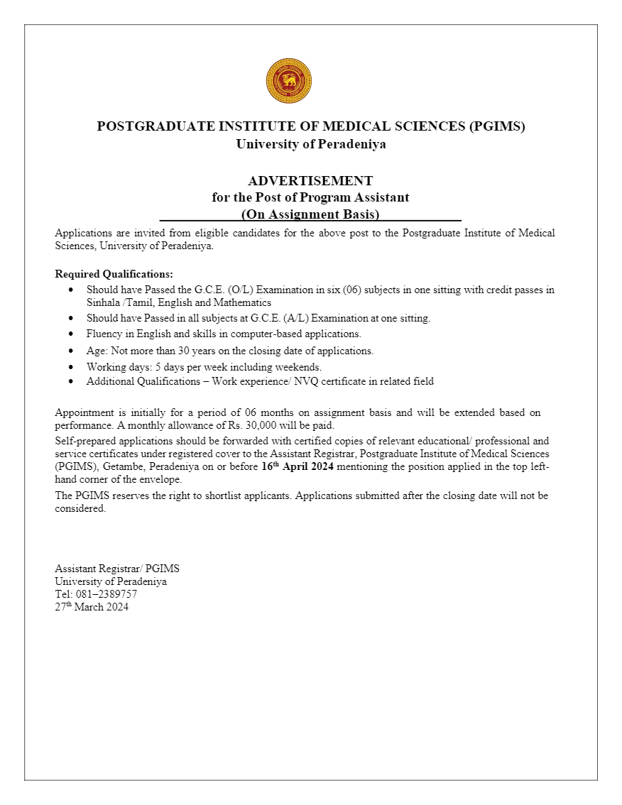 Program Assistant - University of Peradeniya