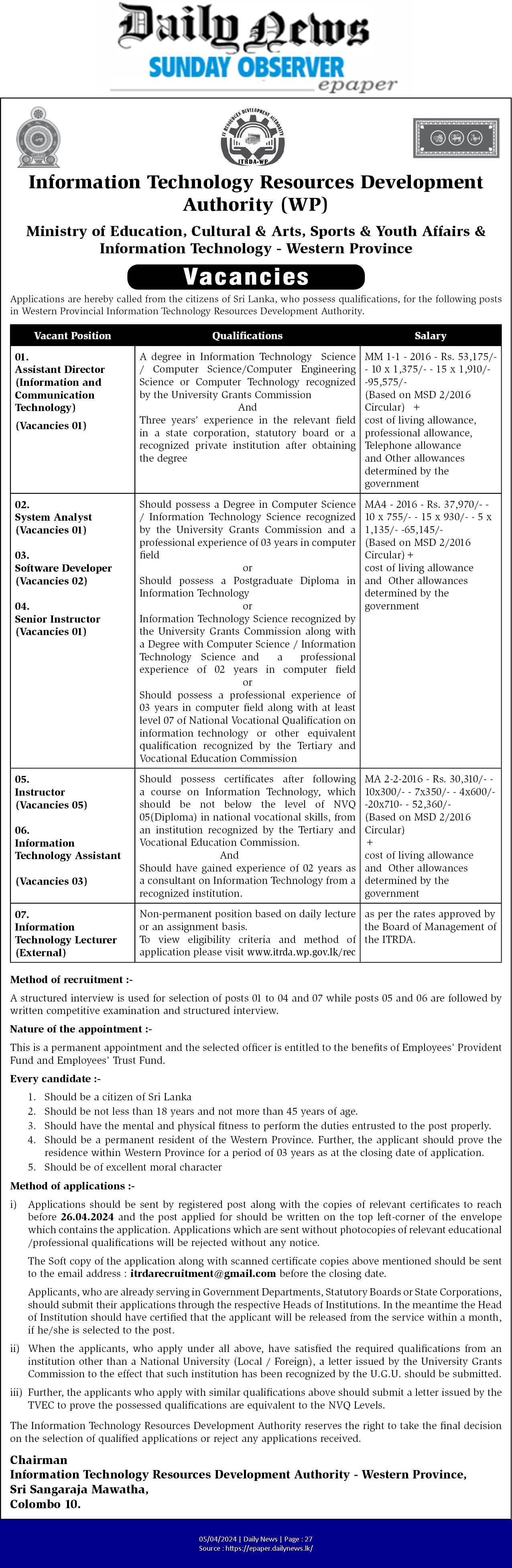Assistant Director, Systems Analyst, Software Developer - Information Technology Resources Development Authority