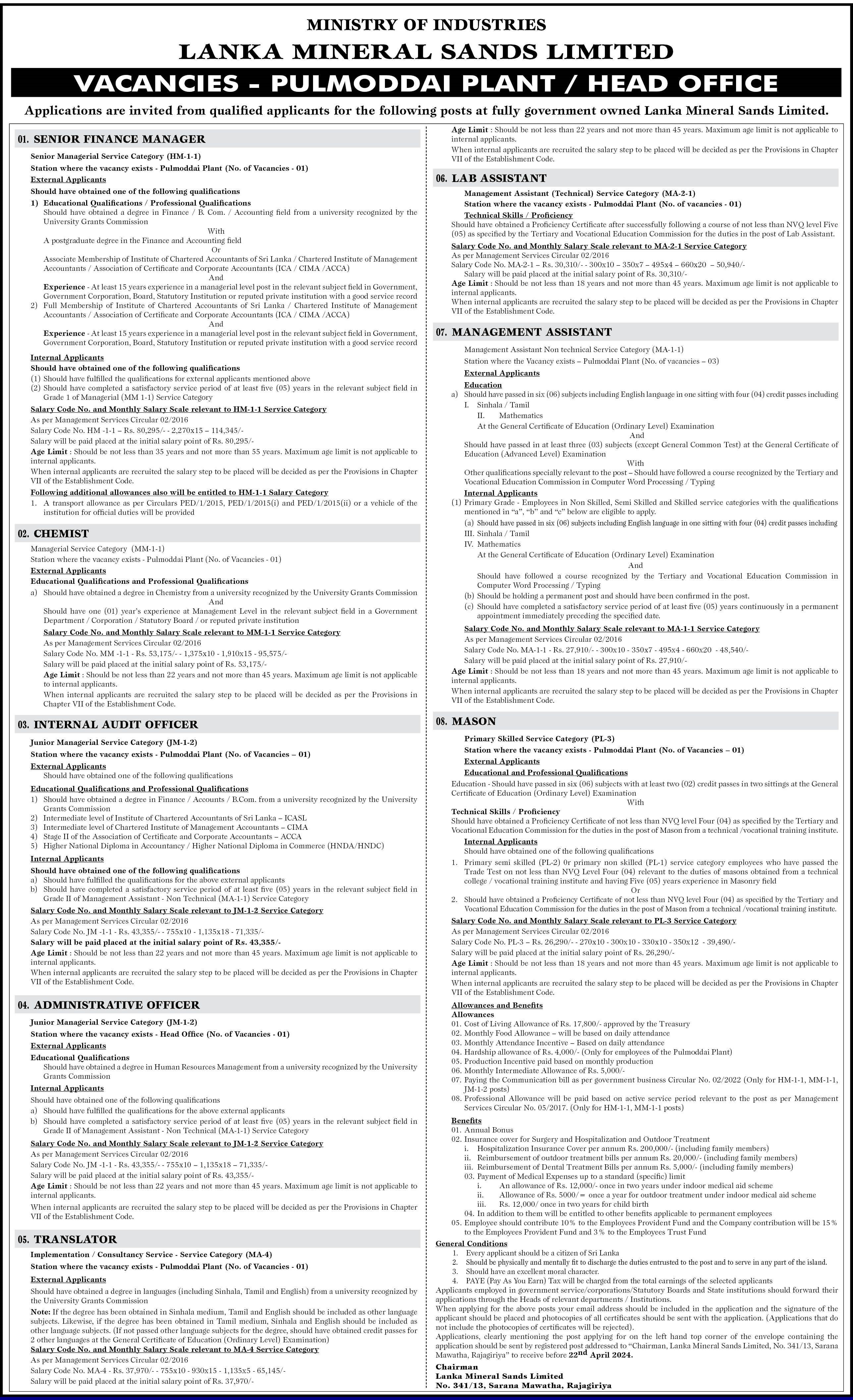 Senior Finance Officer, Chemist, Internal Audit Officer - Lanka Mineral Sands Limited