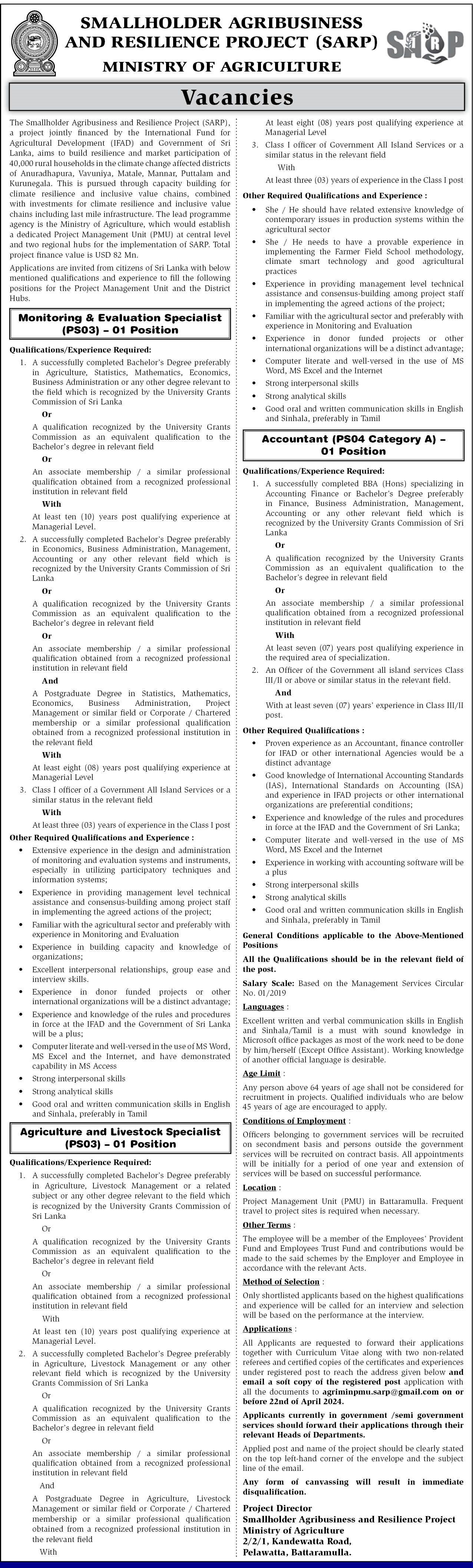 Monitoring and Evaluation Specialist, Accountant - Ministry of Agriculture