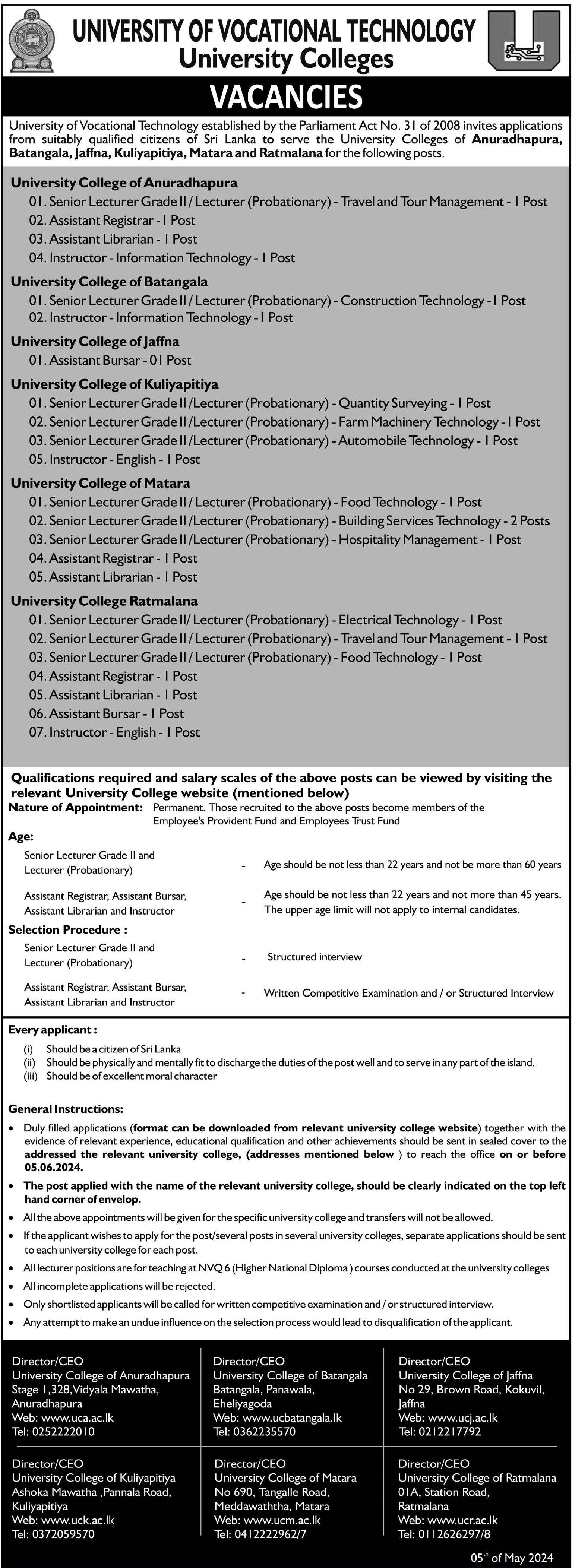 Senior Lecturer, Lecturer, Assistant Registrar - University of Vocational Technology