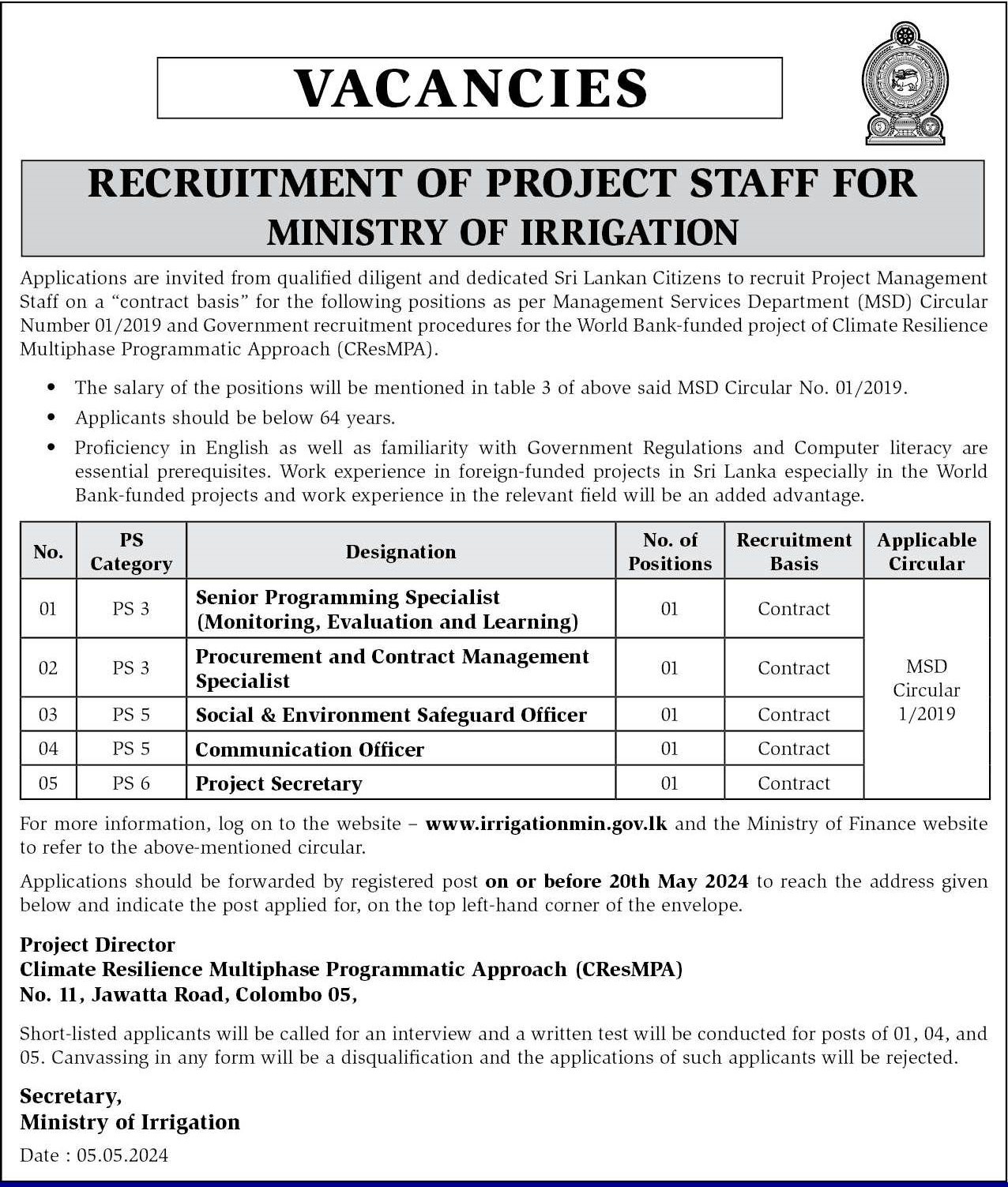 Senior Program Specialist, Procurement and Contract Management Specialist - Ministry of Irrigation