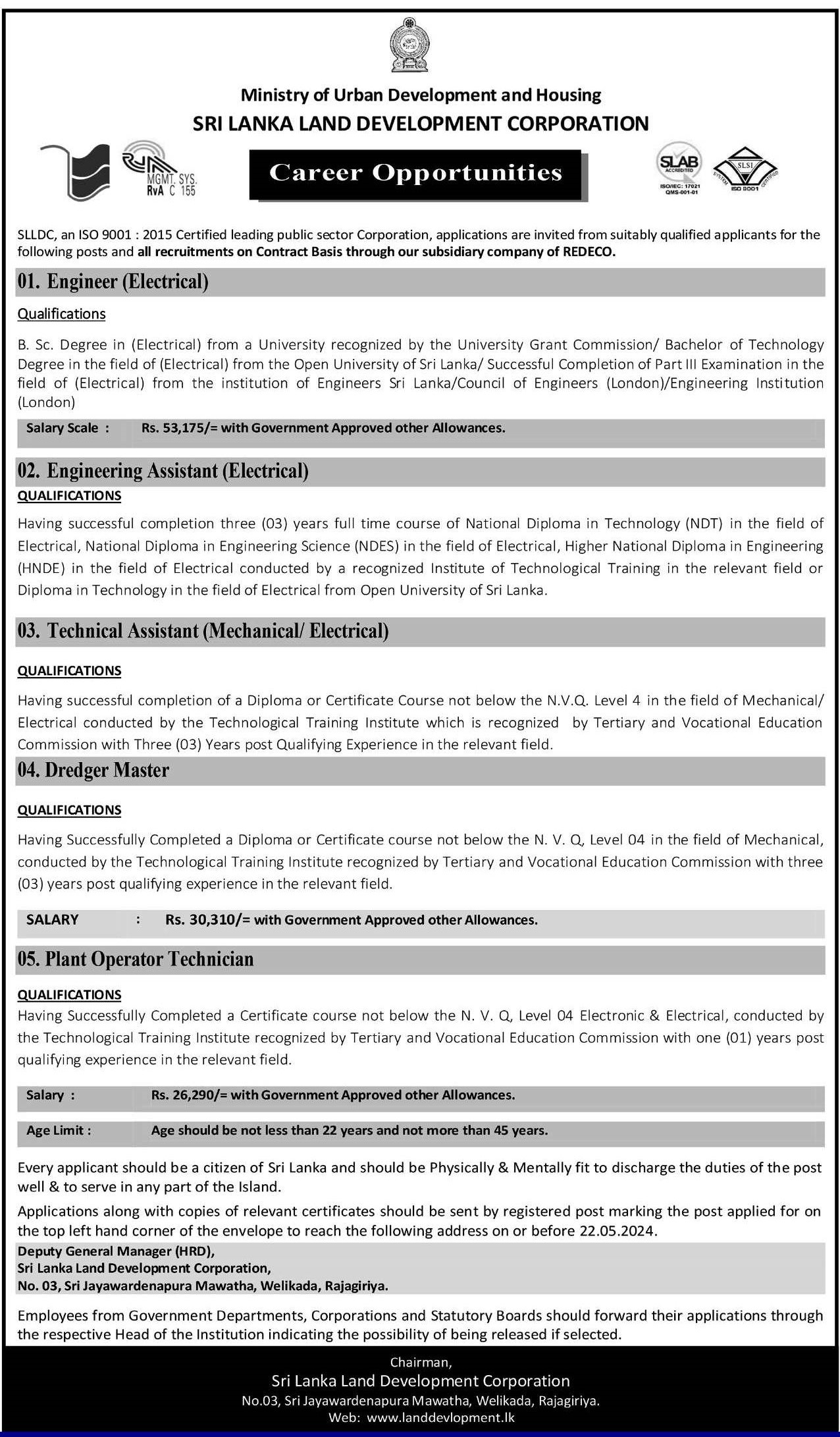 Engineer, Engineering Assistant - Sri Lanka Land Development Corporation