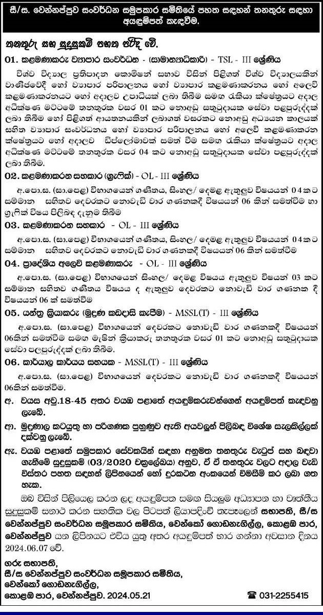 Business Development Manager, Management Assistant, Regional Marketing Manager - Wennappuwa Development Multipurpose Co-Operative Society