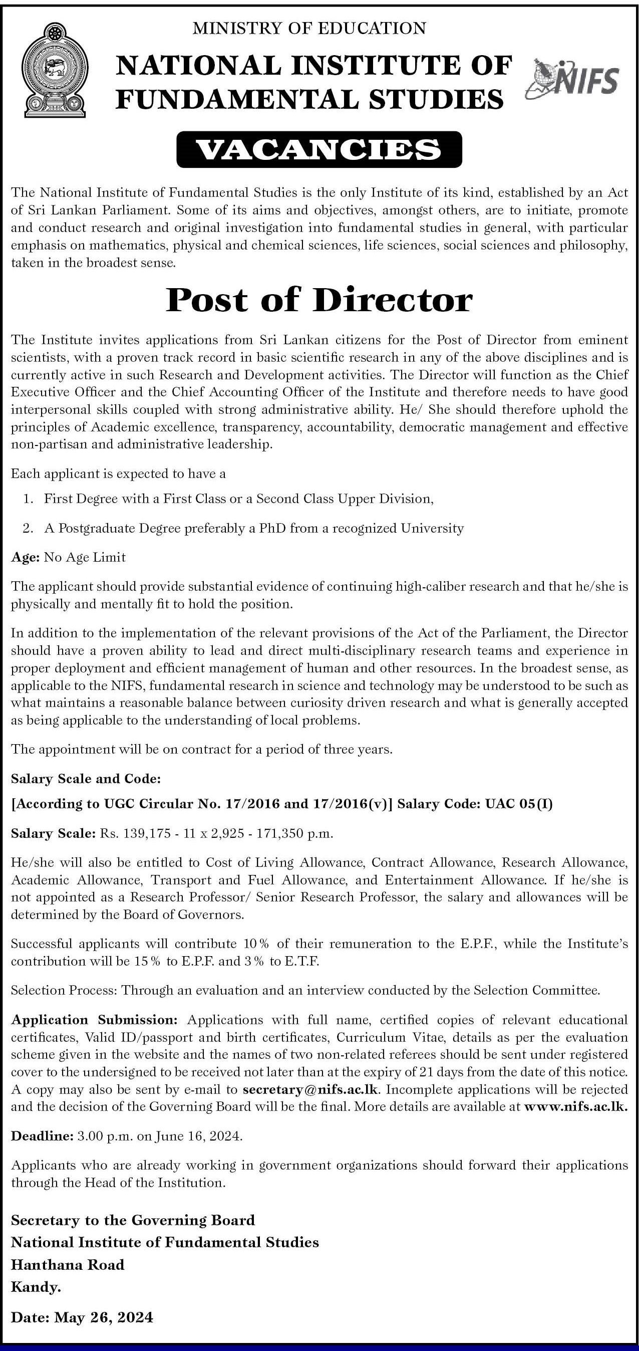 Director - National Institute of Fundamental Studies
