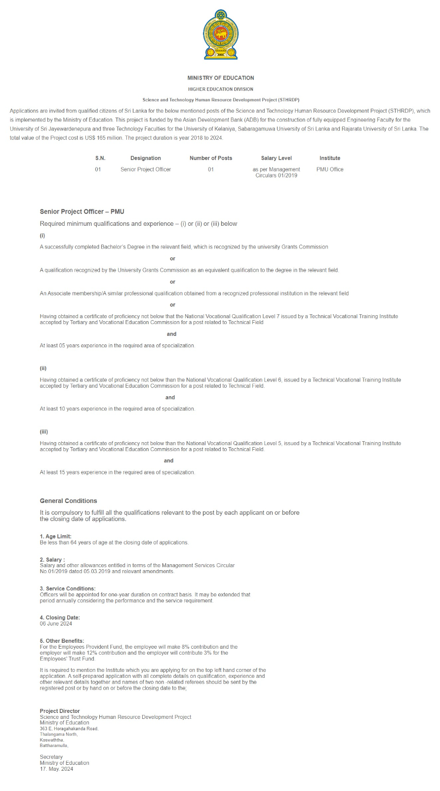 Senior Project Officer - Ministry of Education