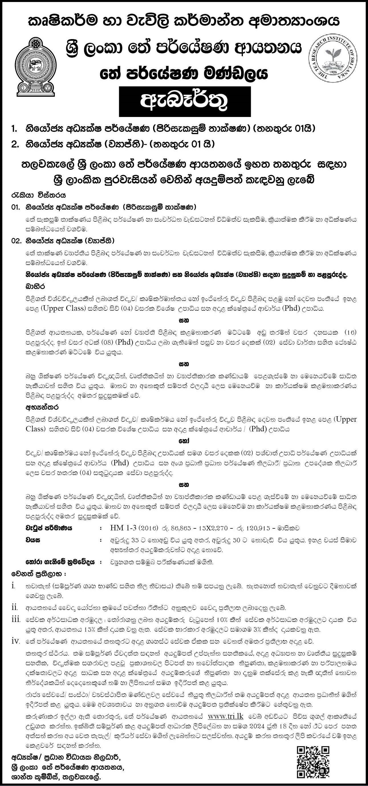 Deputy Director Research, Deputy Director - Sri Lanka Tea Research Board