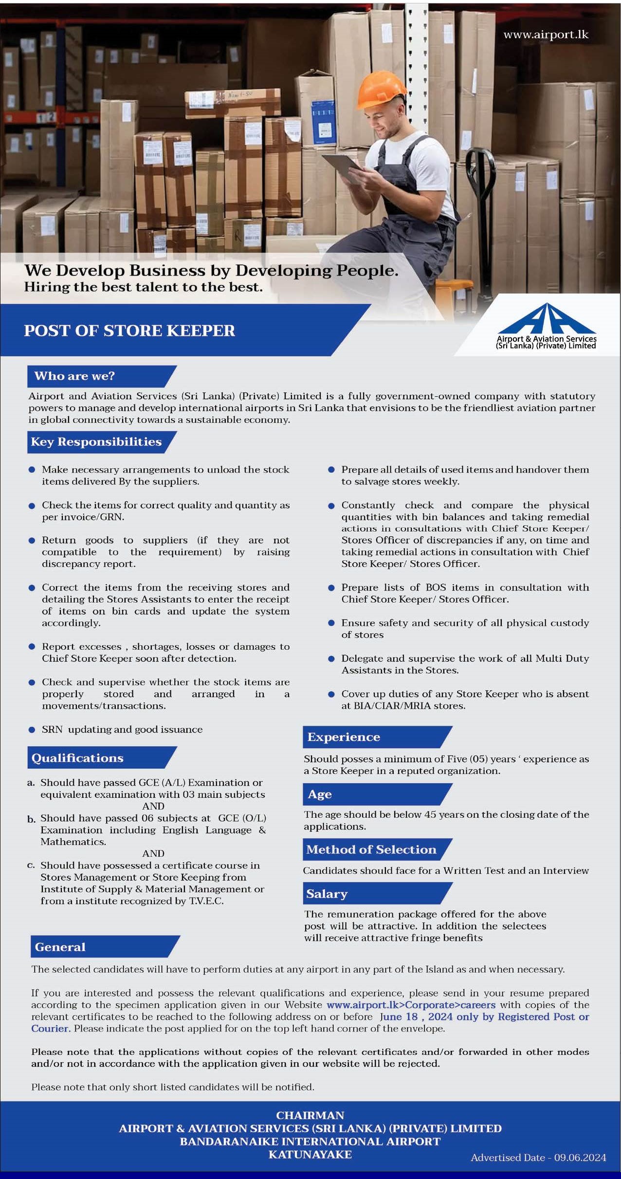 Store Keeper - Airport & Aviation Services (Sri Lanka) Limited