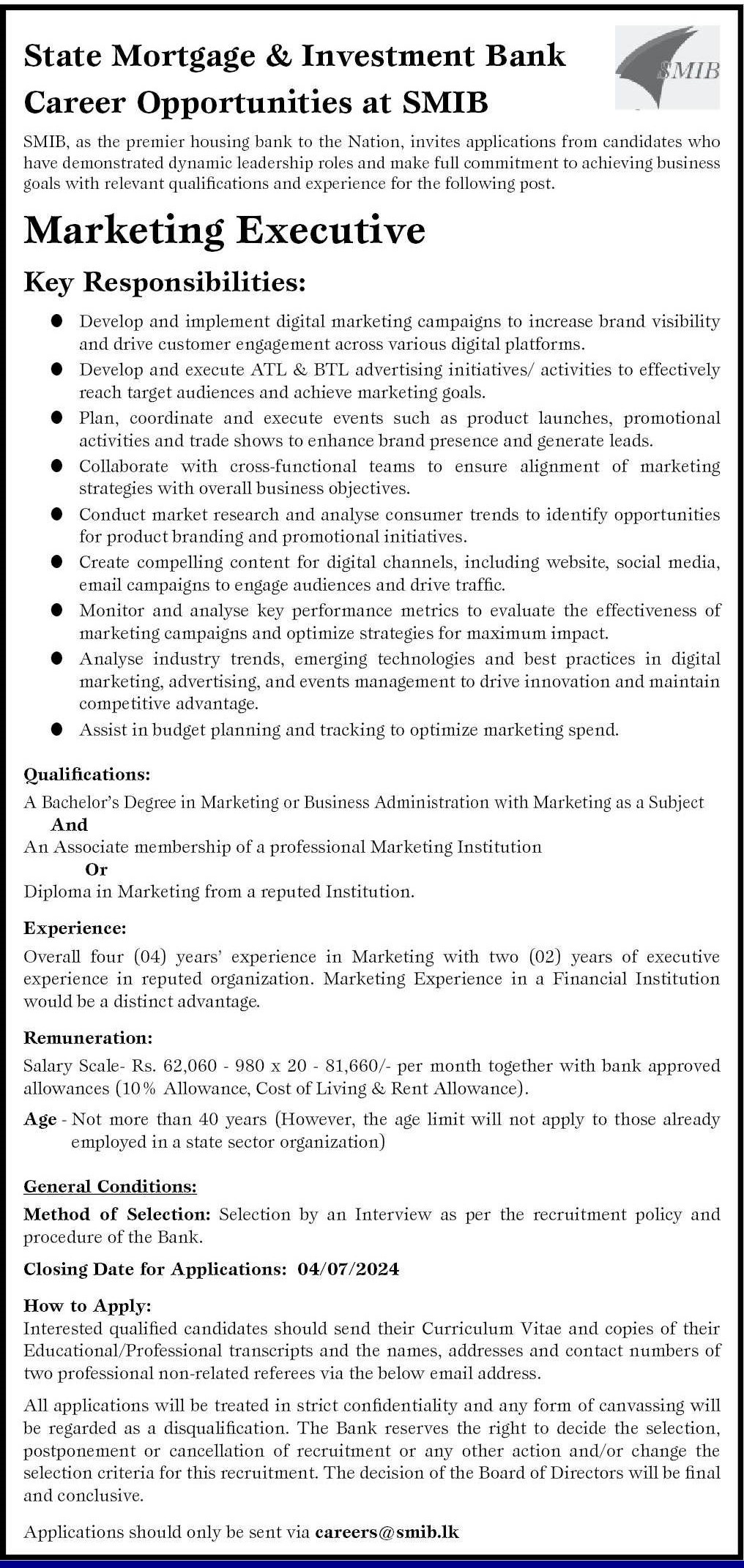 Marketing Executive - State Mortgage & Investment Bank