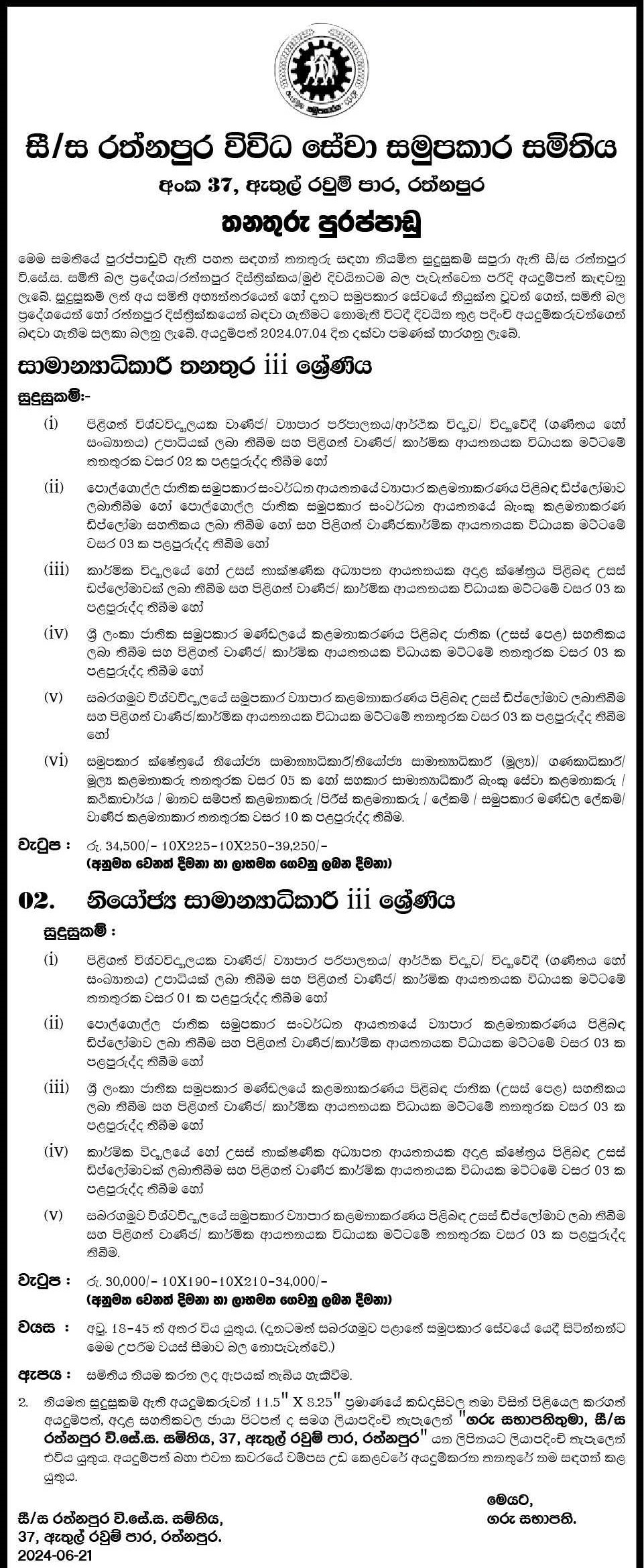General Manager, Deputy General Manager - Ratnapura Multi Purpose Co-operative society Ltd