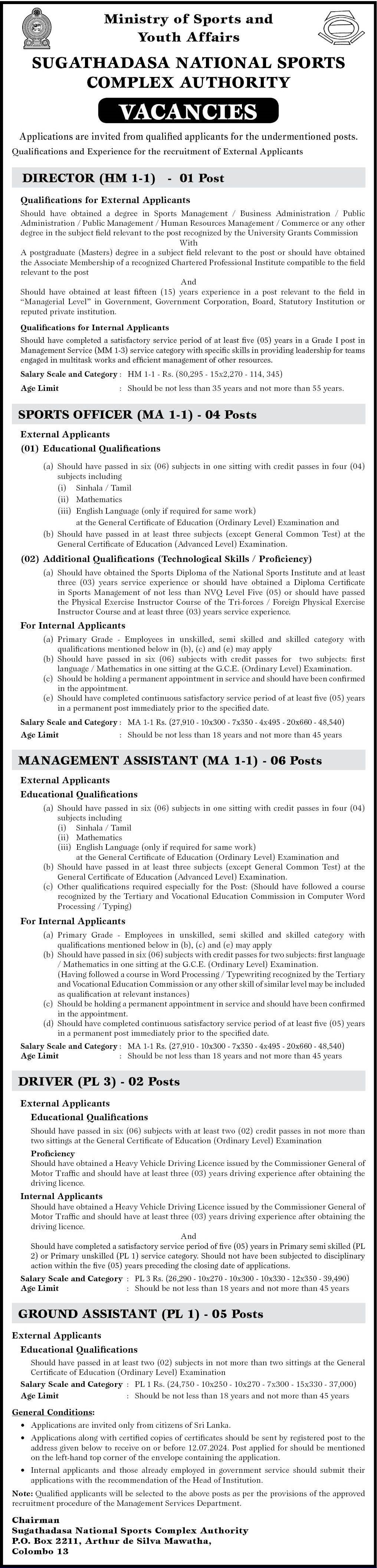 Director, Sports Officer, Management Assistant - Sugathadasa National Sports Complex Authority
