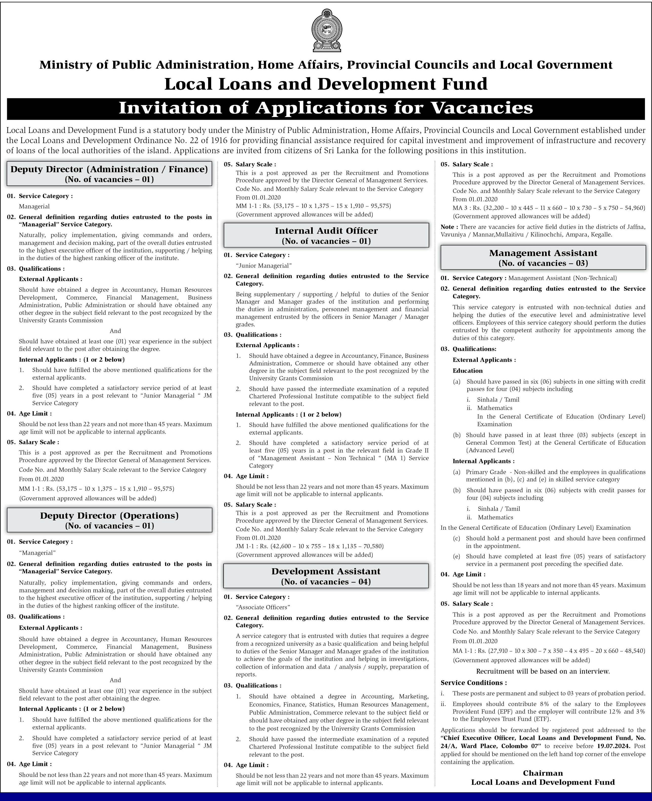 Deputy Director, Management Assistant - Ministry of Public Administration, Home Affairs, Provincial Councils and Local Government