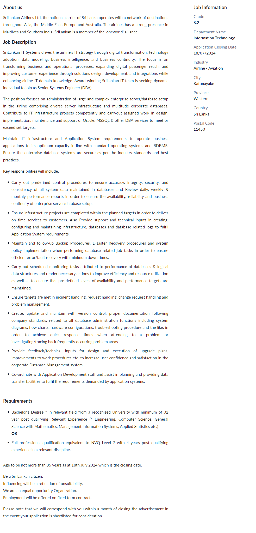 Senior System Engineer - SriLankan Airlines
