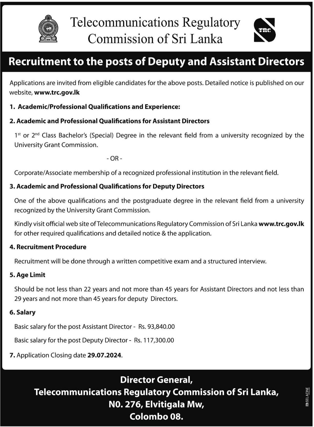 Deputy Director, Assistant Director - Telecommunications Regulatory Commission of Sri Lanka