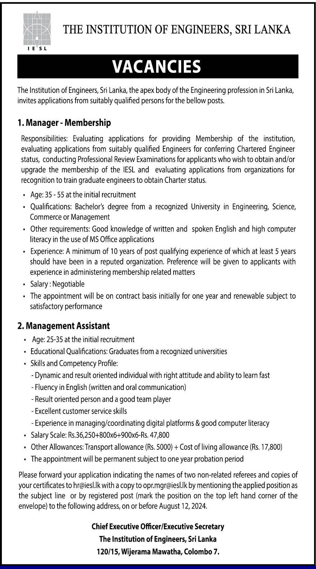 Manager, Management Assistant - The Institution of Engineers Sri Lanka