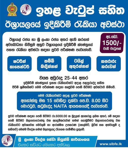 Shuttering Carpenter, Wire Bender, Tile Mason, Mason - Sri Lanka Bureau of Foreign Employment