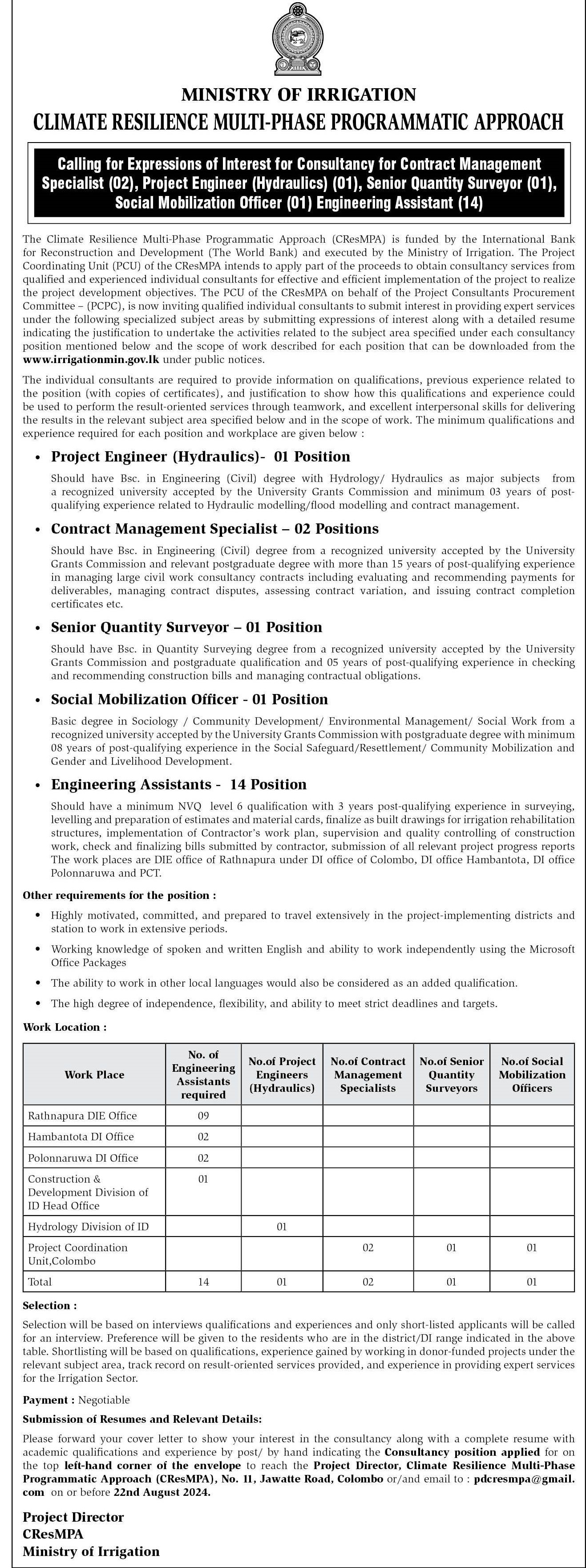 Project Engineer, Contract Management Specialist - Ministry of Irrigation