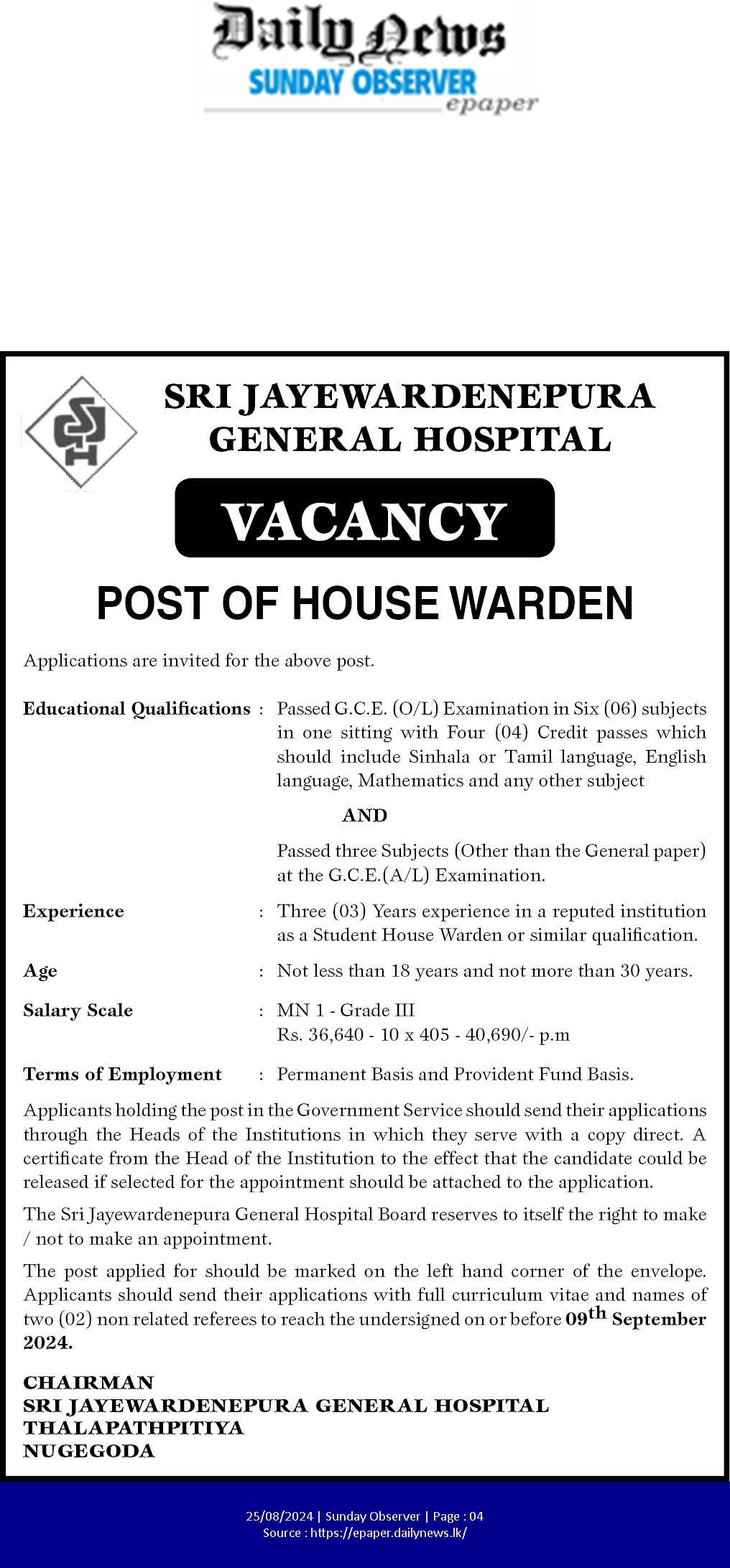 Housekeeper - Sri Jayewardenepura General Hospital