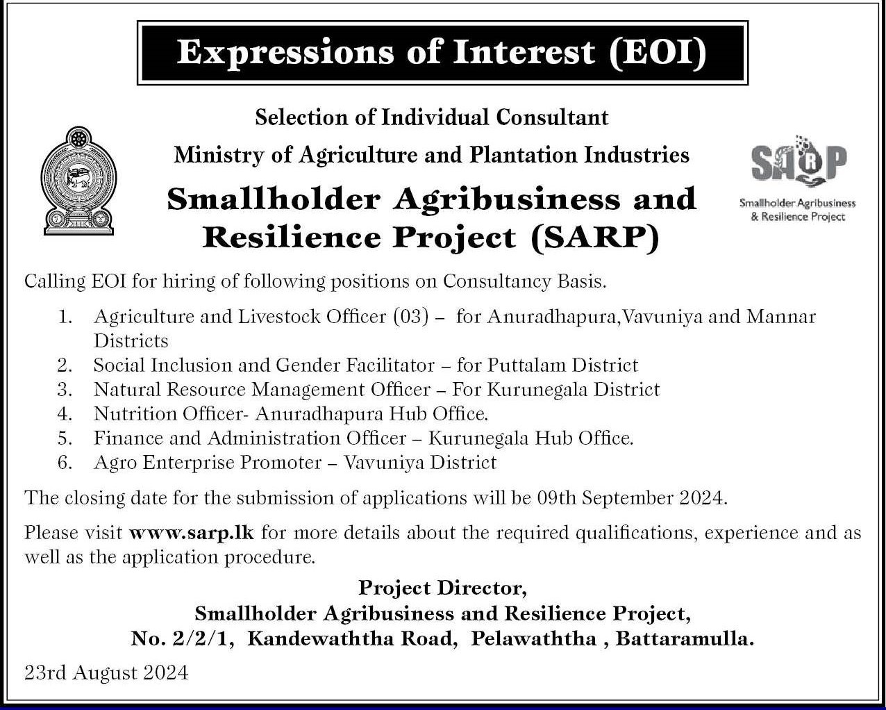 Agriculture and Livestock Officer, Finance & Administrative Officer, Nutrition Officer - Ministry of Agriculture