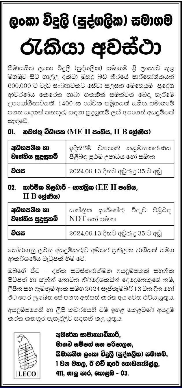 Maintenance Executive, Technical Officer - Lanka Electricity Company (Private) Ltd
