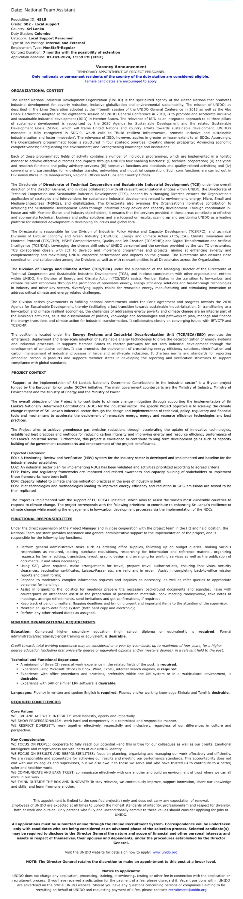 National Team Assistant - United Nations Industrial Development Organization