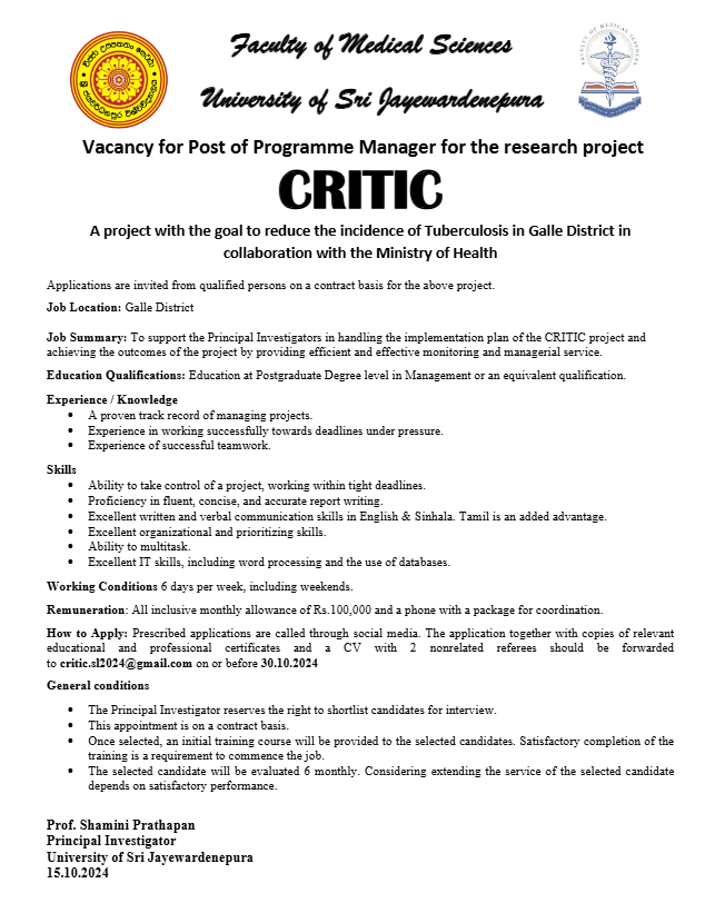 Programme Manager - University of Sri Jayewardenepura