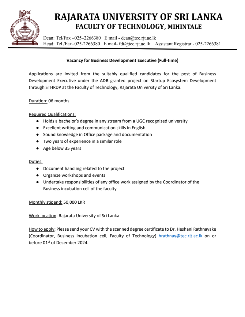 Business Development Executive - Rajarata University
