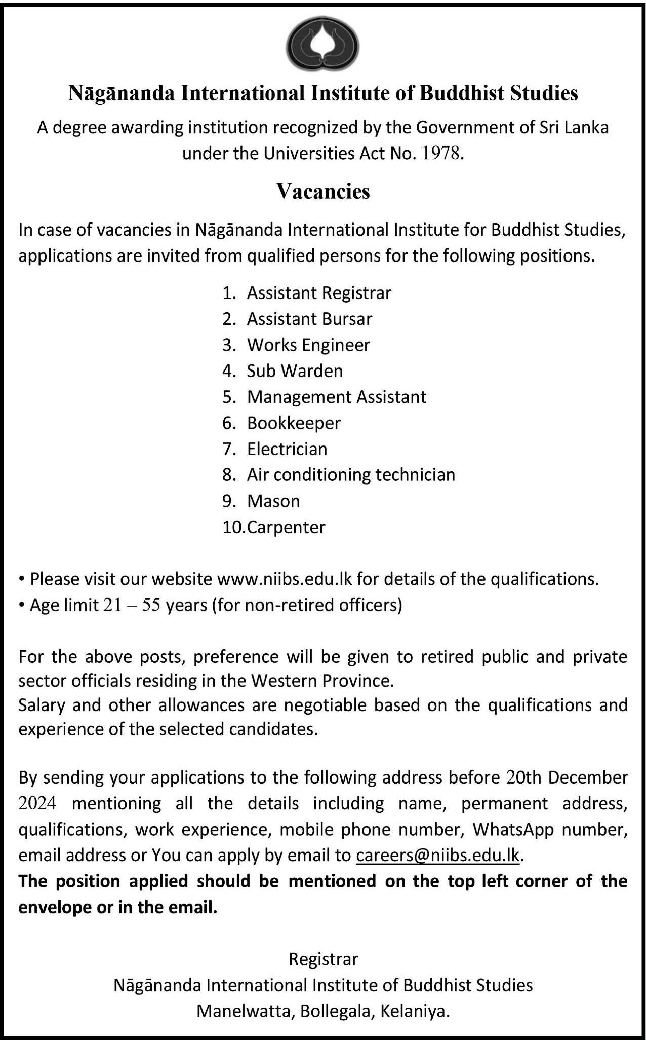 Management Assistant, Assistant Registrar, Electrician - Nagananda International Institute for Buddhist Studies
