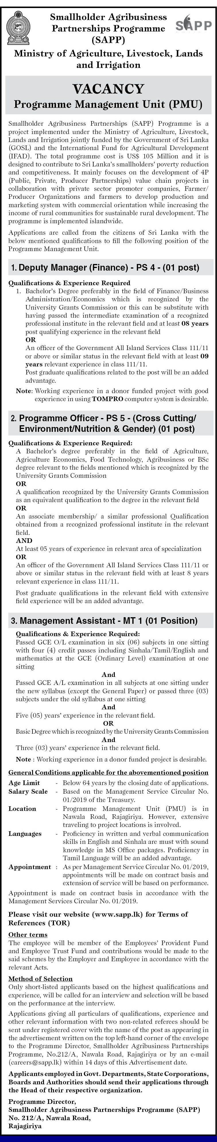 Deputy Manager, Program Officer, Management Assistant - Ministry of Agriculture