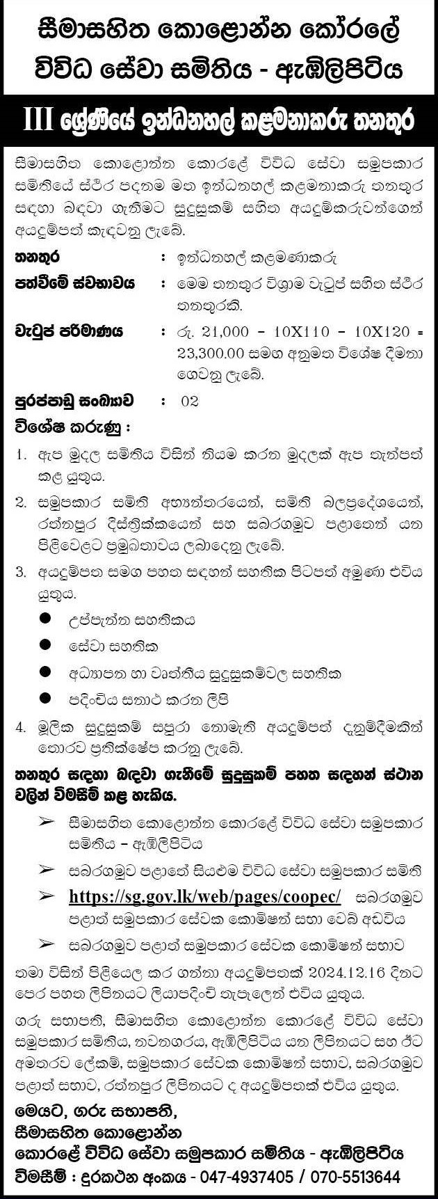 Filling Station Manager - Kolonna Korale Multi Purpose Co-operative Society