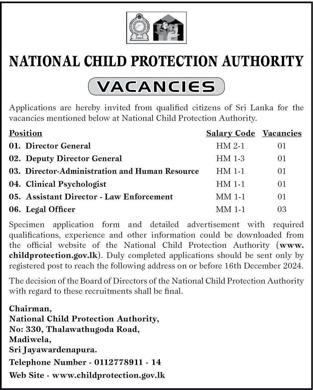 Director General, Deputy Director General, Clinical Psychologist - National Child Protection Authority