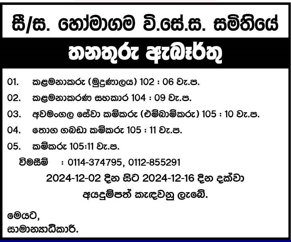 Manager, Management Assistant, Embalmer - Homagama Multipurpose Co-operative Society Limited