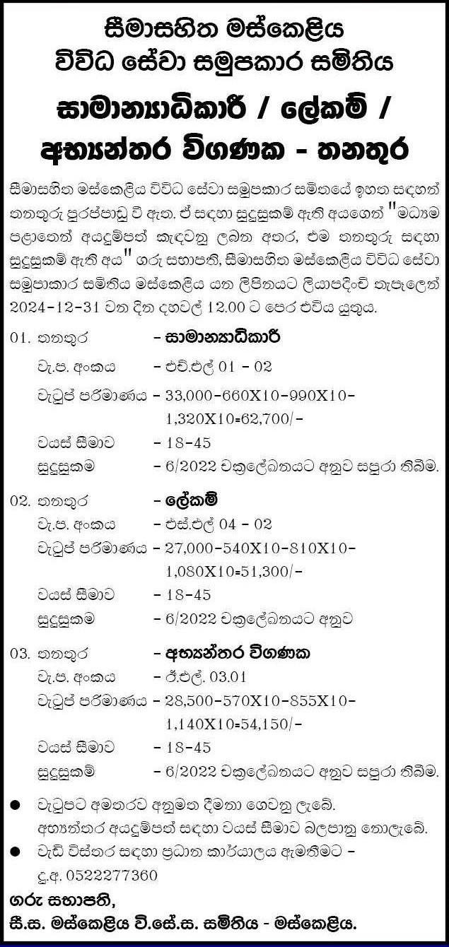 General Manager, Secretary, Internal Auditor - Maskeliya Multi Purpose Co-operative Society Ltd