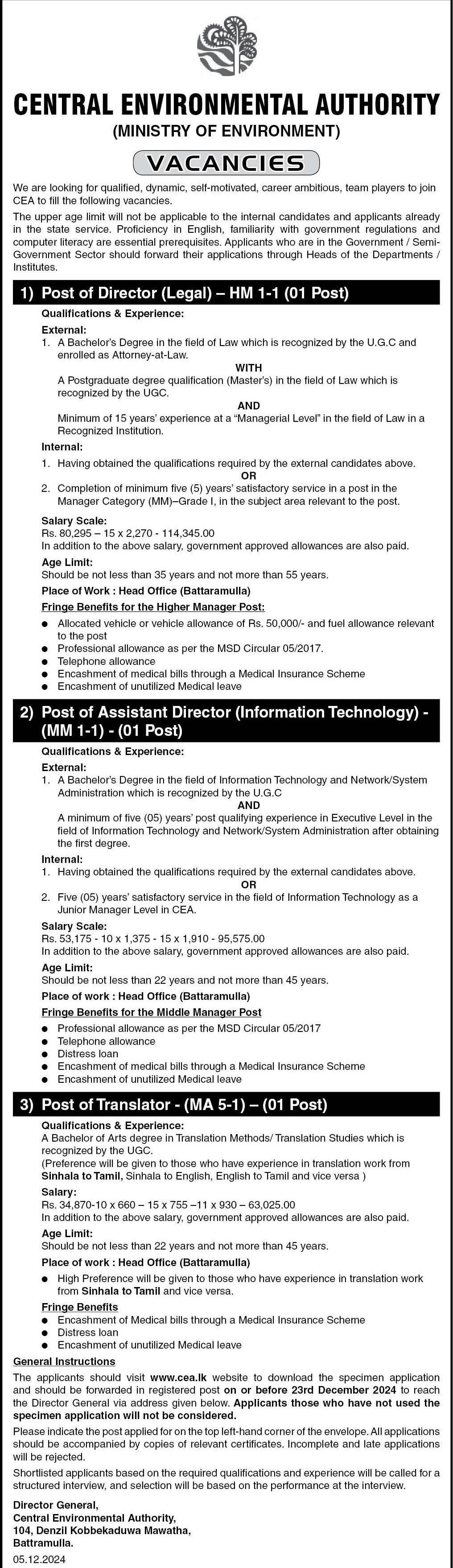 Director, Assistant Director, Translator - Central Environmental Authority