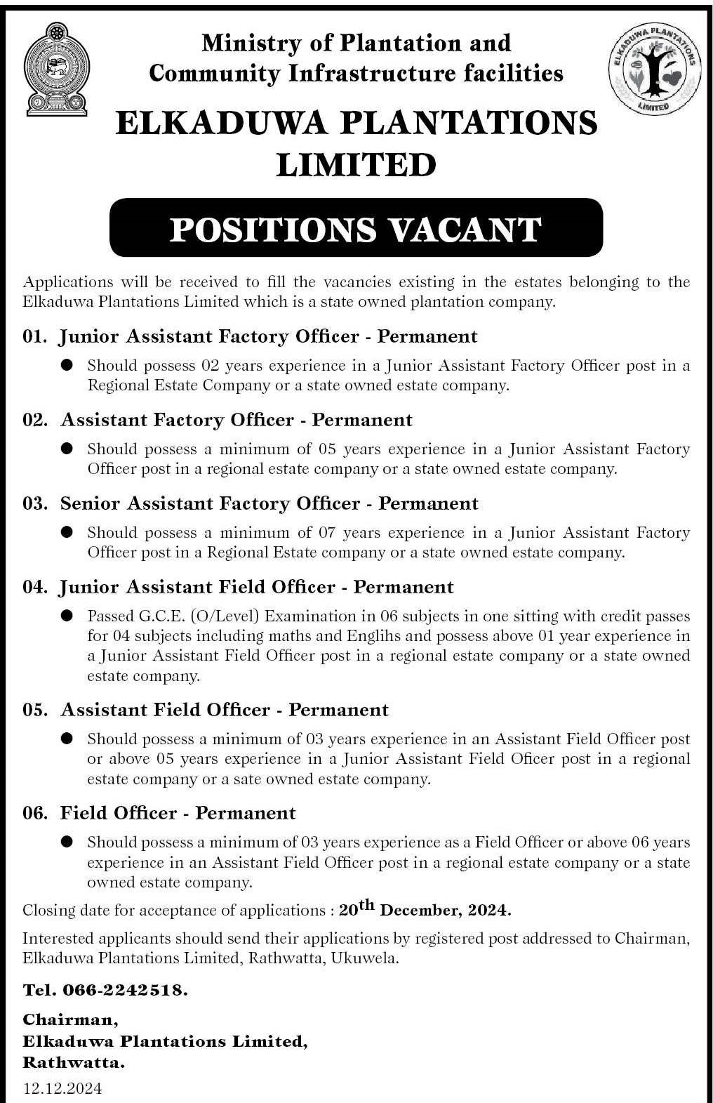 Senior Assistant Factory Officer, Field Officer - Elkaduwa Plantation Ltd