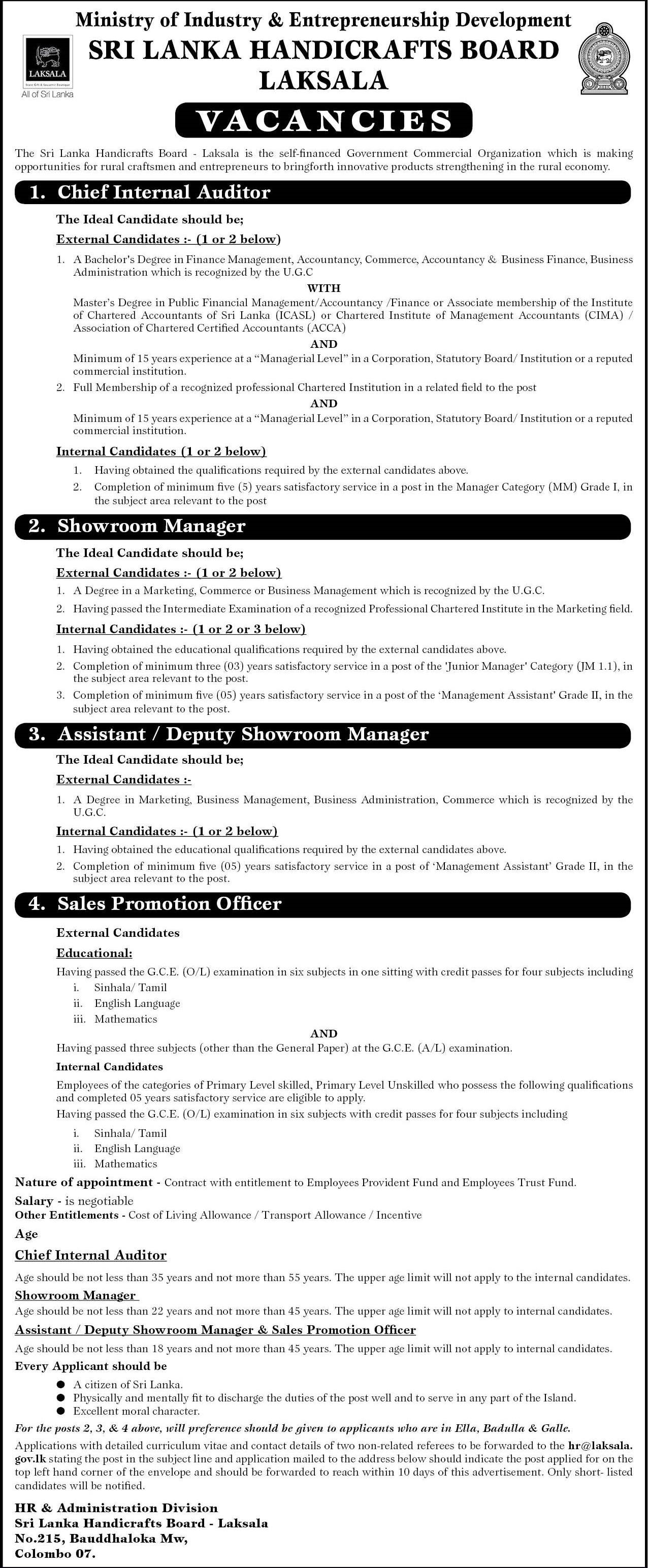 Chief Internal Auditor, Sales Promotion Officer, Showroom Manager - Sri Lanka Handicrafts Board