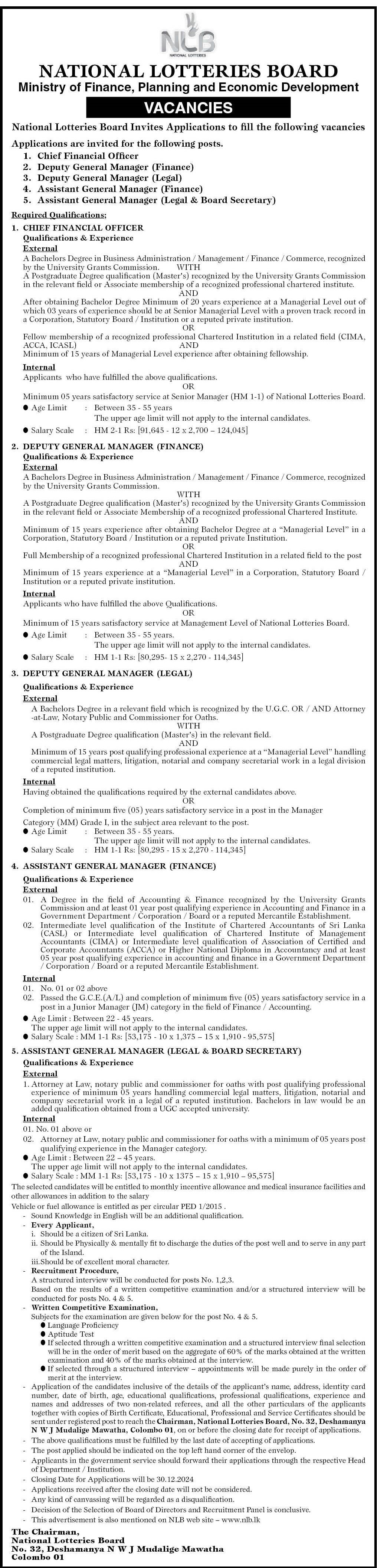 Chief Financial Officer, Deputy General Manager, Assistant General Manager - National Lotteries Board