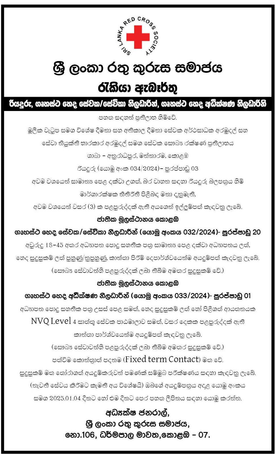 Driver, Domestic Nursing Officer, Domestic Nursing Supervisor - Sri Lanka Red Cross Society