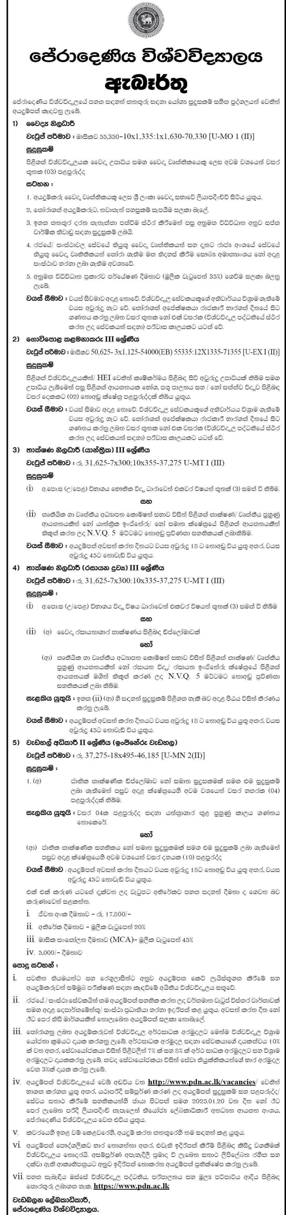 Medical Officer, Farm Manager, Technical Officer - University of Peradeniya